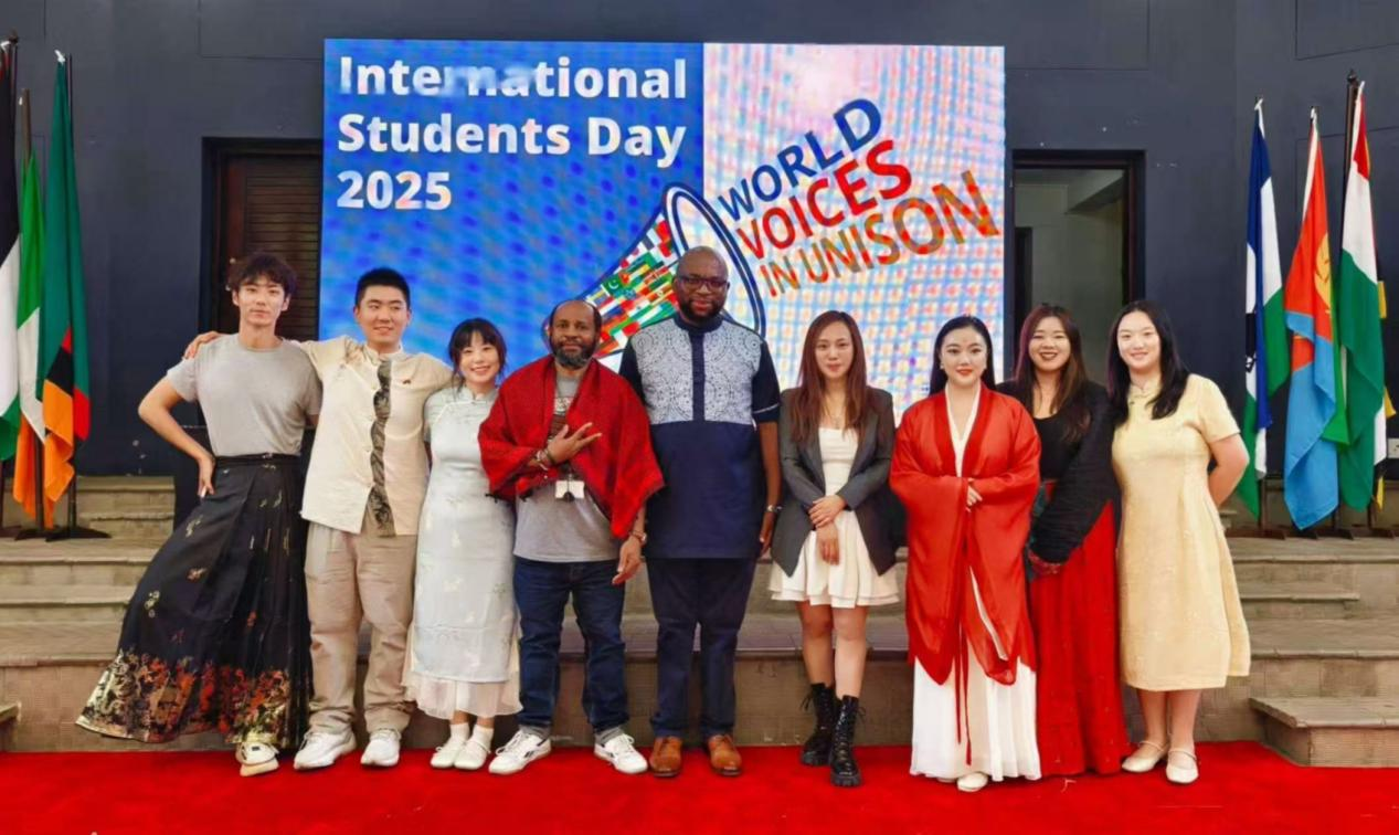 近日,南非比勒陀利亚大学哈特菲尔德校区晨雾未散,紫楹花道间2025年比勒陀利亚大学“国际学生日”正式启幕。今年,上海杉达学院南非中国文化和国际教育交流中心孔子课堂(以下简称“南非中国文化中心孔子课堂”)作为特别来宾出席了此次盛典。并以“月满中秋照中南,万里情牵共婵娟”为主题,将茶艺、月饼、快板、空竹、书法、中国舞与国旗游行汇聚为一条美丽的中国文化画卷,在二十多国展台间成为最具人气的存在。 在王清超老师的阵阵快板声中,杨煜老师现场耍着空竹。空竹高速转动与盘线摩擦发出“呜呜”哨音,像极了中国庙会里